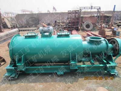 除塵器處理回收的粉塵由星型卸料閥將灰塵送入機體內的螺旋輸送葉片上,經螺旋推入加濕攪拌主筒,在螺旋體均勻的拌料下,水噴淋均勻注入料內,在勻速攪拌的作用下,使粉塵加濕,加濕后的粉塵在多柱螺旋線性的推力作用下,從出料口緩緩送出,卸入機體外的粉塵運送裝置。在螺旋體的勻速運轉時,振動裝置間歇性的工作,使拌料筒周壁等變幅振蕩,將加濕后的粘性粉體與金屬筒壁脫離, 送 卸料口排出。